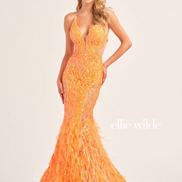 Ellie Wilde EW35009 Prom Long Formal Detachable Feather Dress