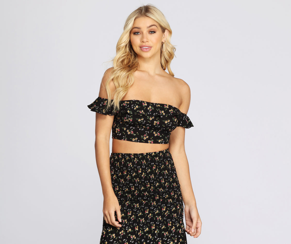 You'll look oh so darling in this cute ditsy floral crop top! It features an off the shoulder square neckline with short ruffle sleeves, a stretchy smocked back, and a cropped hem. The top is composed of a lightweight woven fabric. Complete your look with the matching maxi skirt!