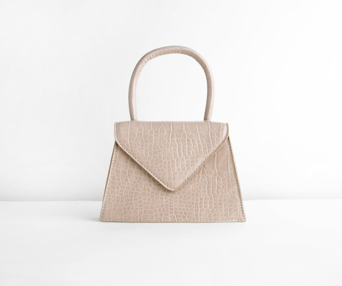 Treat yourself! This purse features an envelope style flap top with a snap closure. Also has a handle, and is composed of a fauleather material that is textured, and has a knit inner lining. Detachable shoulder strap included.