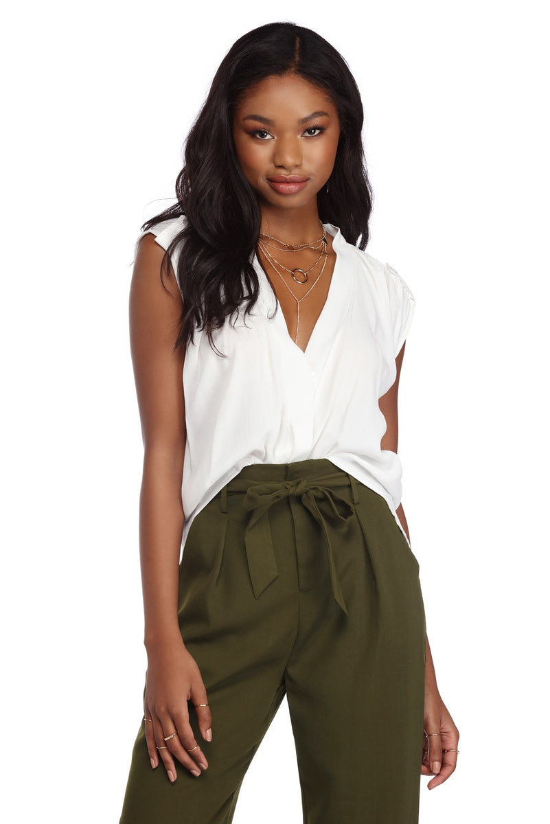 Add some drama to your everyday fit in this surplice top that's perfect for layering! Top is sleeveless with buttoned shoulder tabs with pin tucks, a draped open front, and an overall relaxed fit.
