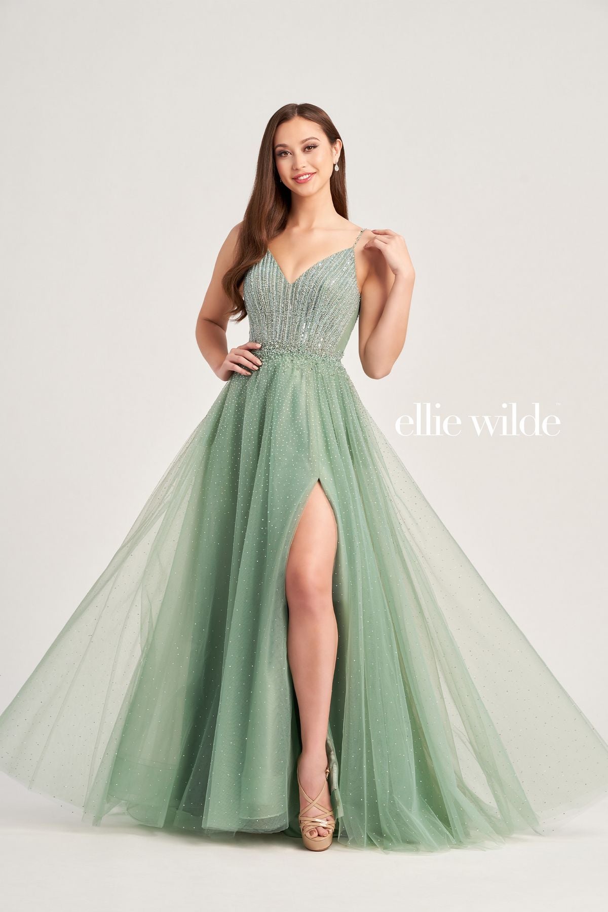 Ellie Wilde EW35088: Glitter tulle elegance, V-neckline, beaded waist. Elevate your style with this prom ballgown. Shop now!