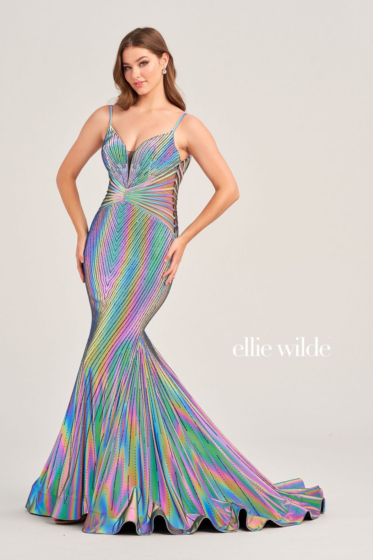 Embrace allure in Ellie Wilde EW35704 Supernova prom dress. Plunging neckline, linear beadwork, illusion midriff, and elegant court train.