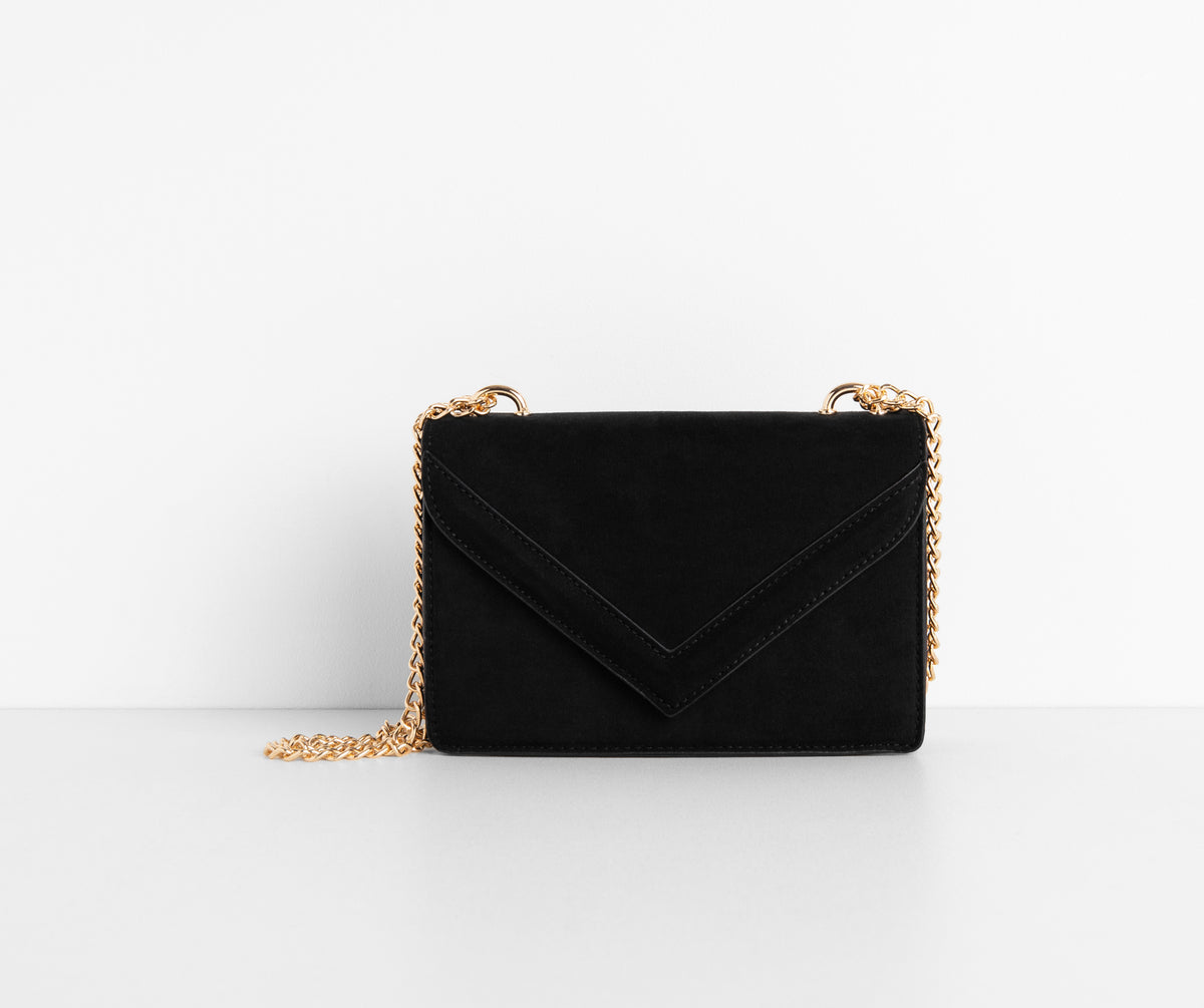 Complete your simply stunning look! This envelope style purse is designed with a structured rectangular body, an double envelope closure, and a gold link chain strap. Composed of a fausuede material.