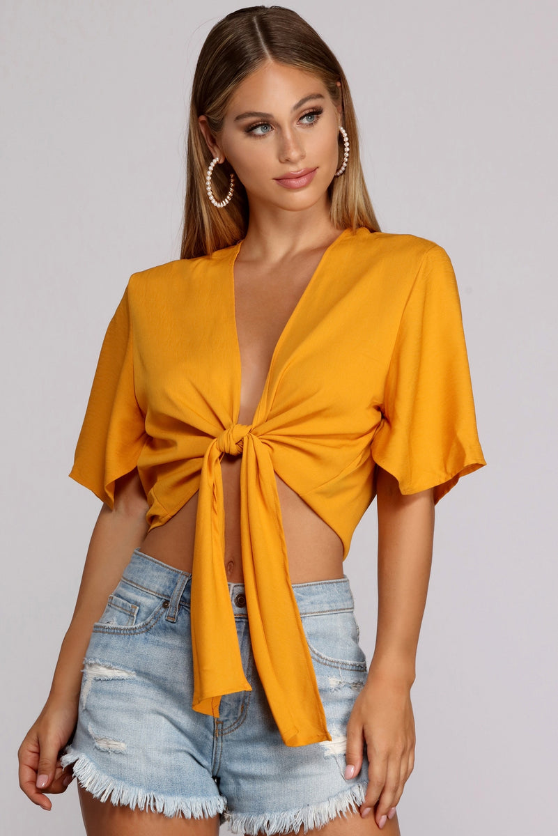 Go with the flow of this pretty tie front top! It features short flowy kimono style sleeves paired with a tie front and a cropped hem. The top is composed of a woven fabric with no stretch and offers a relaxed and comfortable fit.