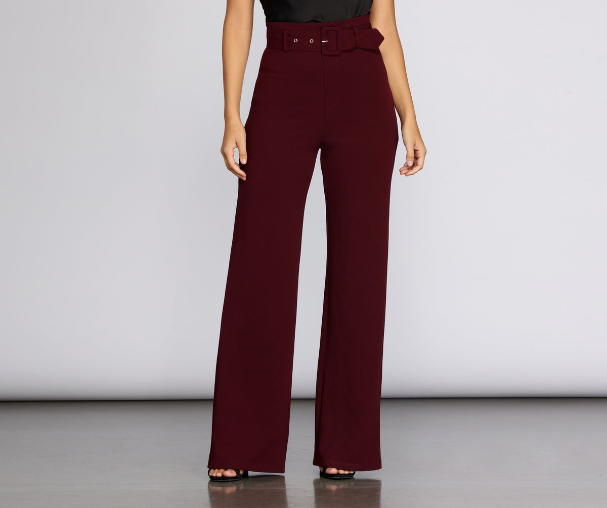 These belted straight leg pants are a must for the fall season! They feature a high rise waist, a back zip and hook and eye closure, a belt with a rectangular buckle, and straight pant legs. The bottoms are composed of a crepe fabric with moderate stretch.