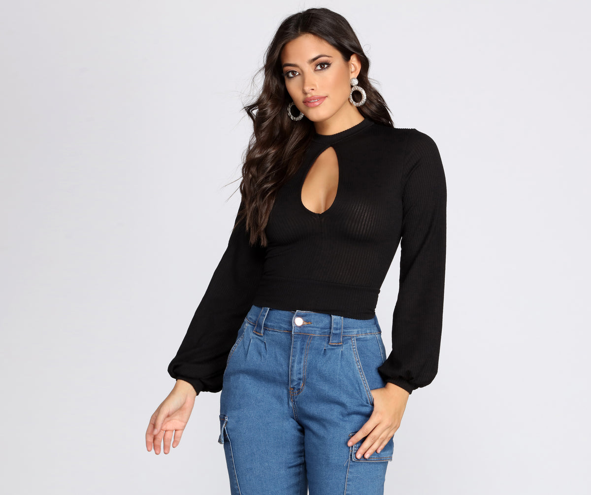 This stylish top will have the key to your heart! It features a mock neck, long loose sleeves with cuffs, a front keyhole cut out, and a banded mid-length hem. The ribbed knit fabric has moderate stretch.