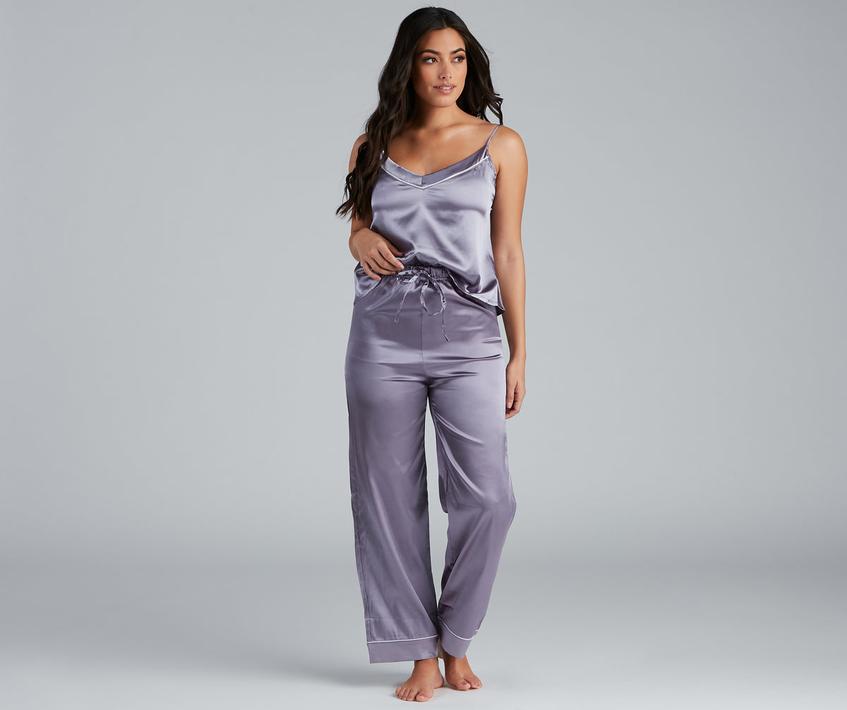 The finer things in life include this satin pajama set! Featuring a cami top with adjustable spaghetti straps, a v-neckline with trim, and a relaxed hem. The matching high-rise pants have an elastic drawstring waist and relaxed hem with trim. Complete the look in cozy slippers.