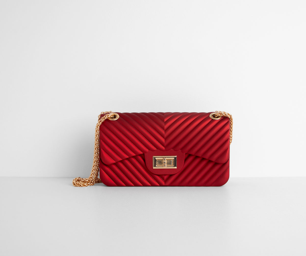 Keep it sleek with this cross body to complete your look! Purse is composed of a jelly matte V quilted body, a fold over flap with fasten closure and dainty attached chain that can be either a cross body single strap or double up and make it a shoulder strap. I