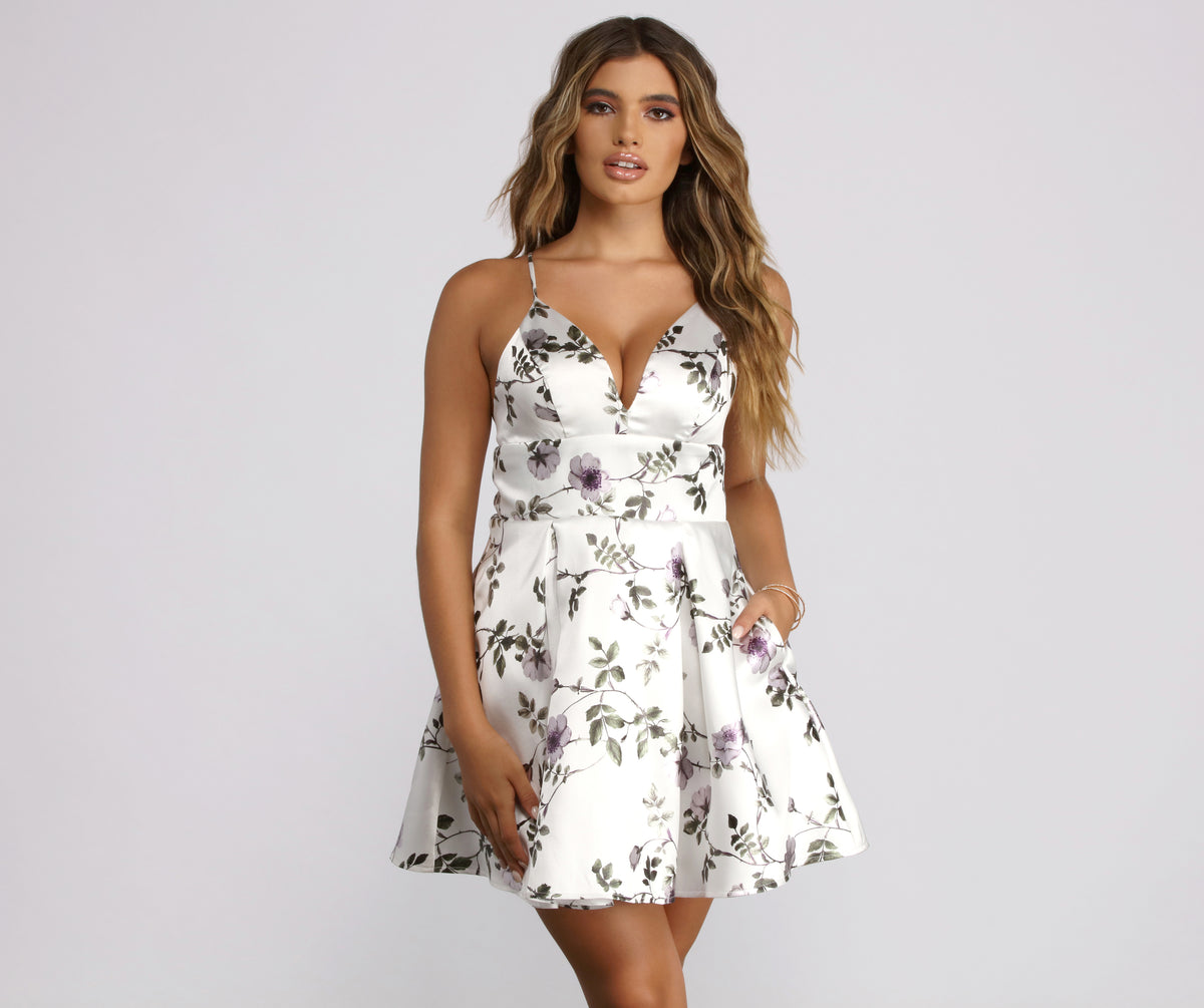 Special Occasion Stun in a satin dress as you make an enchanting entrance at homecoming. Molly features a gorgeous foiled floral print, trendy pockets to keep essentials close to you, and a bold open accented with adjustable cross-straps. Complete your head-turning look with rhinestone earrings and chrome heels.