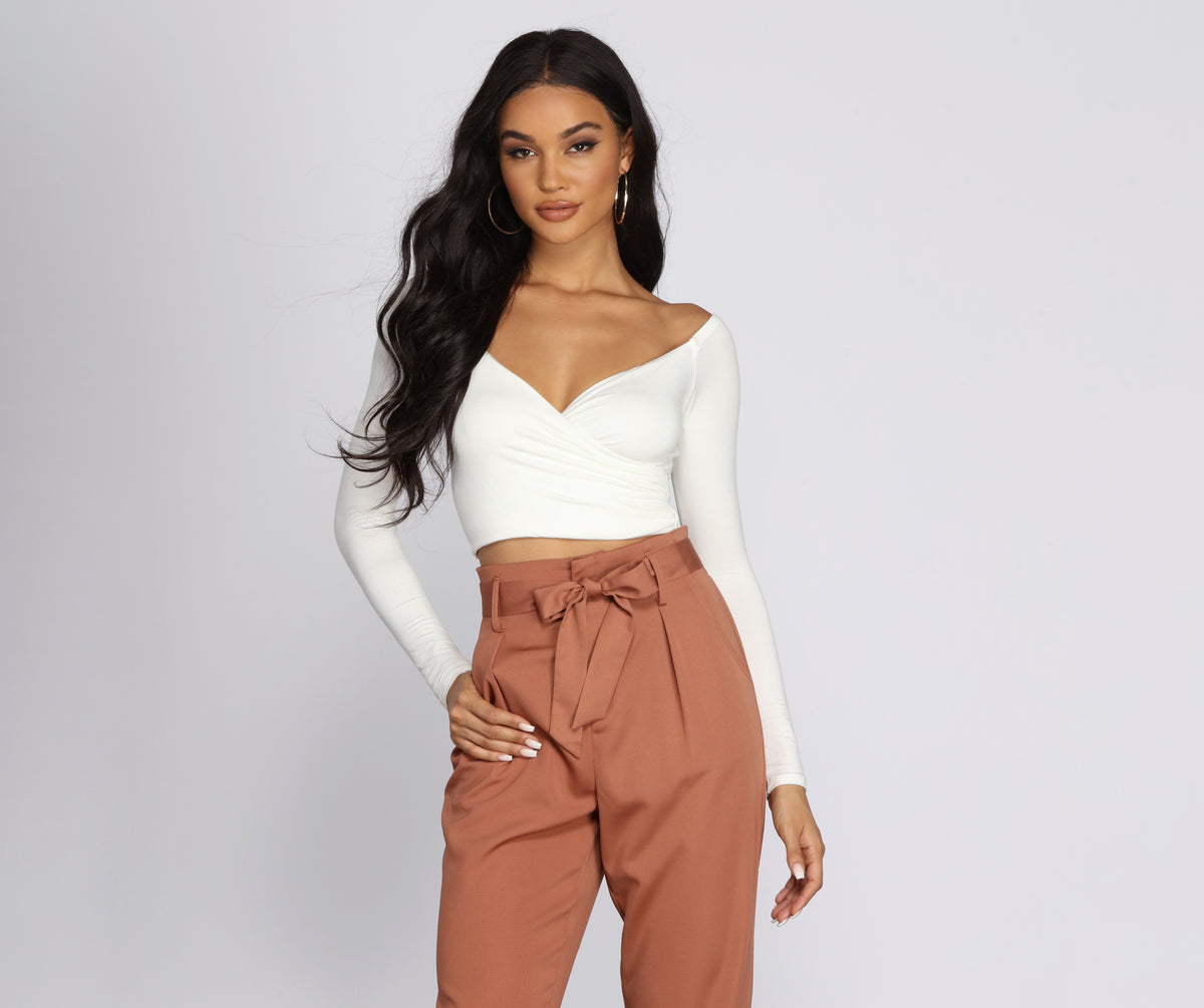 This adorable wrap front crop top is perfect for your next brunch out with the girls! It features an off the shoulder neckline, long fitted sleeves, a wrap front creating a V neckline, and a cropped hem. The soft knit fabric offers plenty of stretch and a form-fitting style.