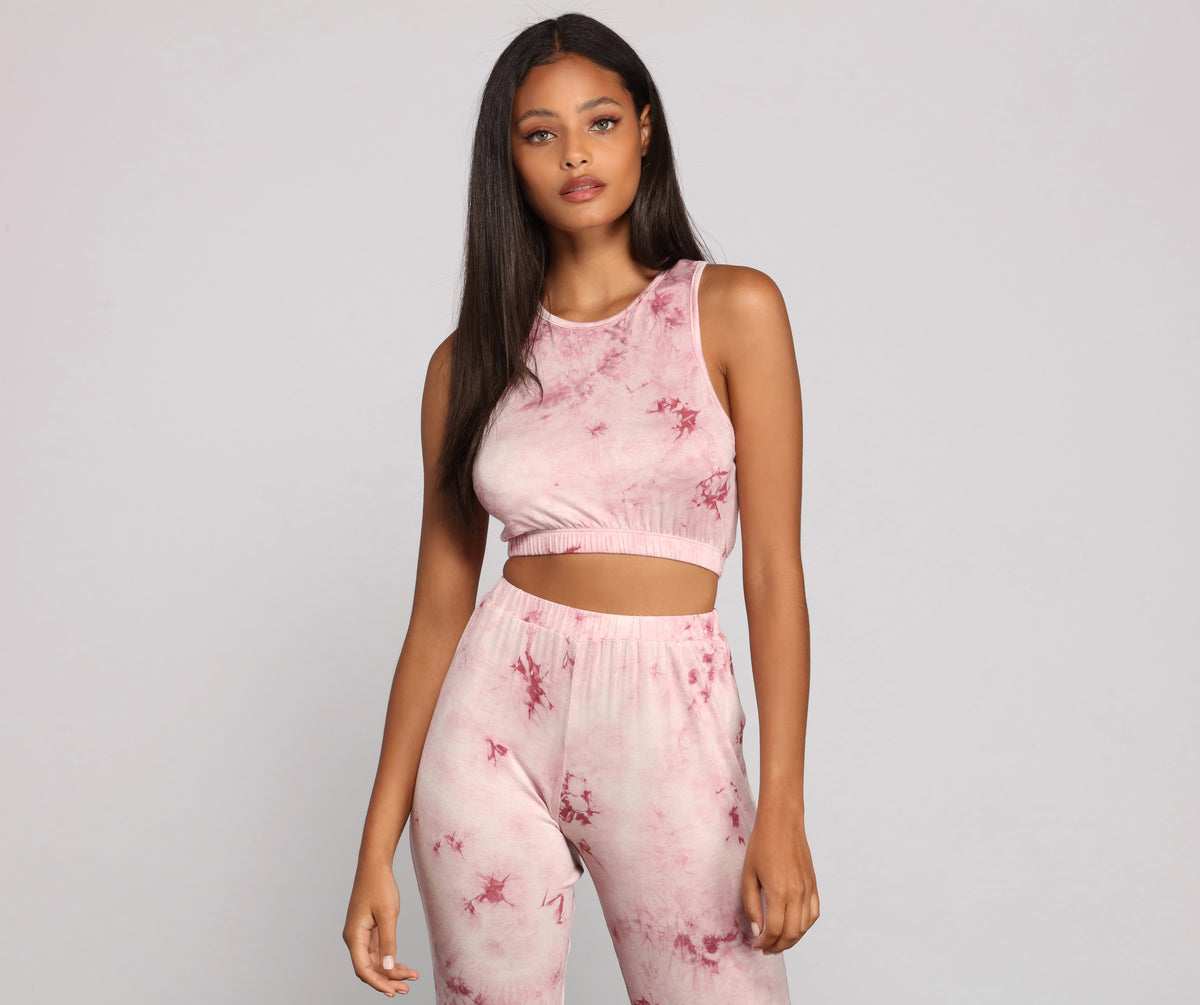Give your loungewear a pop of retro with this cute pajama crop top! The crop top features a sleeveless crew neckline, a tie-dye print, and a smocked cropped hem. Complete look with the matching pajama joggers.