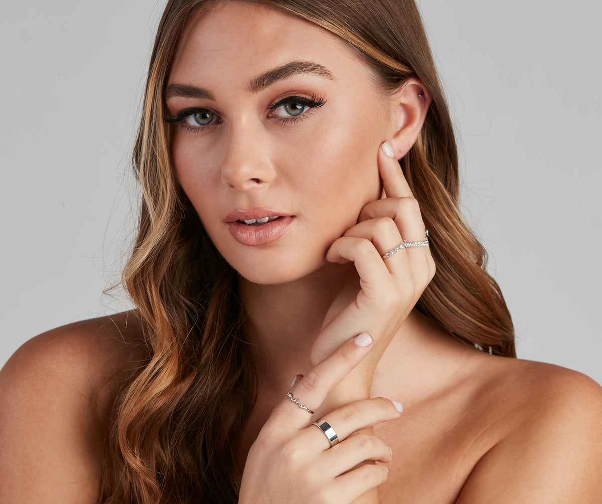 You're the queen of shine with this glam ring set! It features a set of five with one solid band, one interlock band, and three dainty rhinestone bands. Complete the look with a sleek necklace.