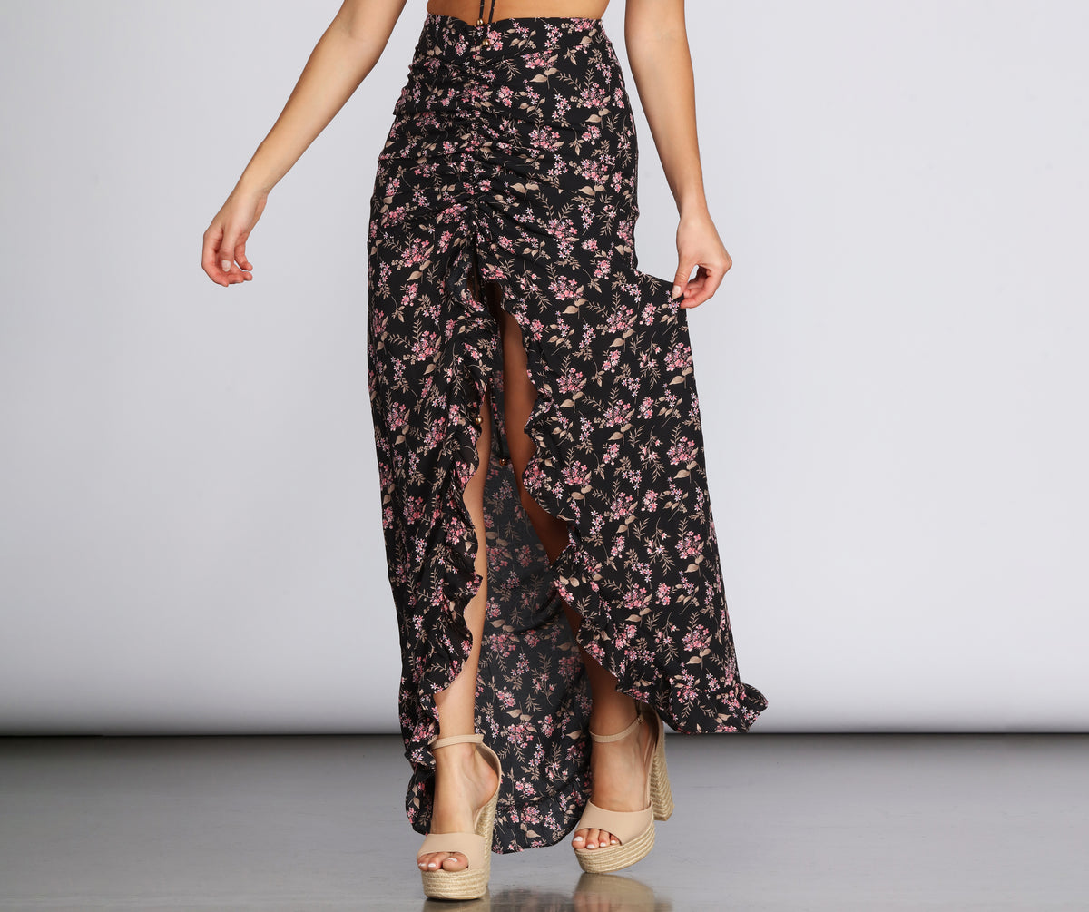Featuring a delicate floral set against a black background, this maxi immediately draws the eye! Skirt features a back zip with hook-and-eye closure, a ruched front anchored by an adjustable bead-detailed tie, and a front slit and hem with ruffle trim.