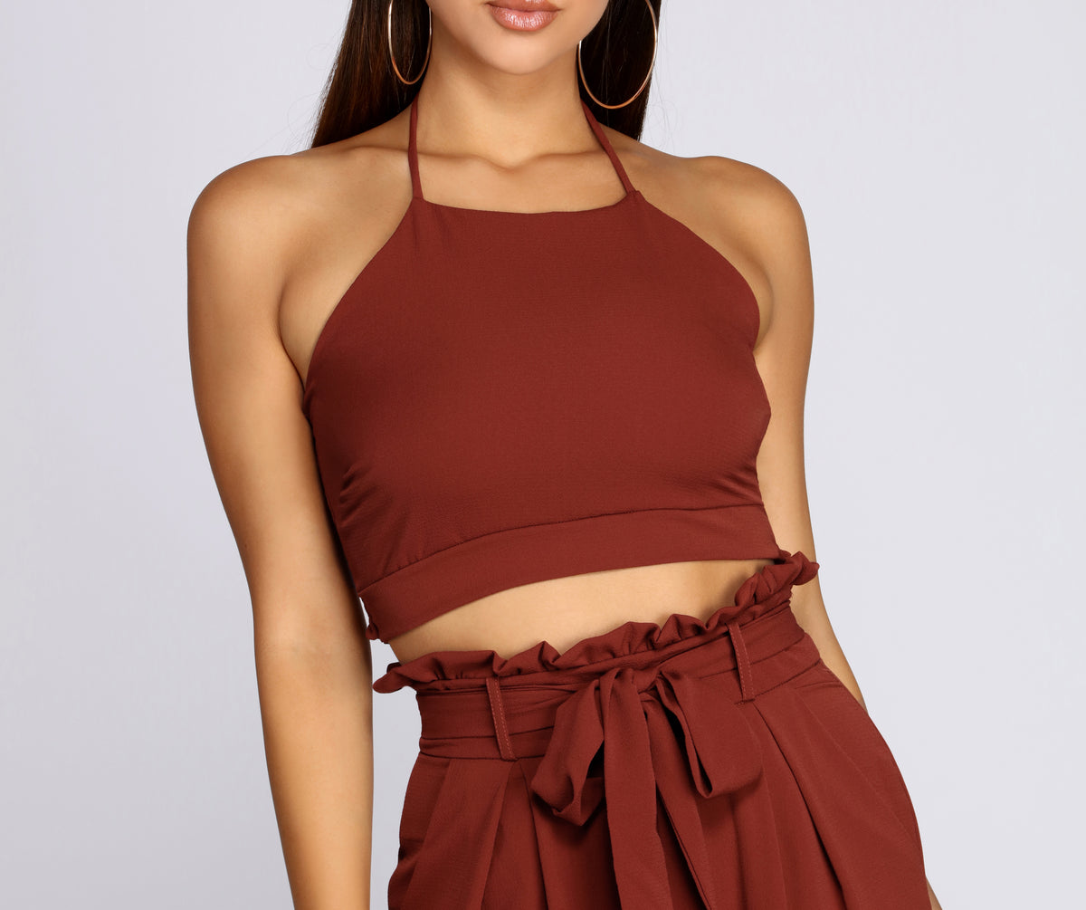 Channel retro-chic vibes in this cute textured crepe crop! Top features a halter-style tie neck, a seamed bust, a slim seamed panel just below, and a fully smocked back. Top slips on and is made from a lightweight woven material with moderate stretch. Don't forget to pair it with the matching paperbag pants!