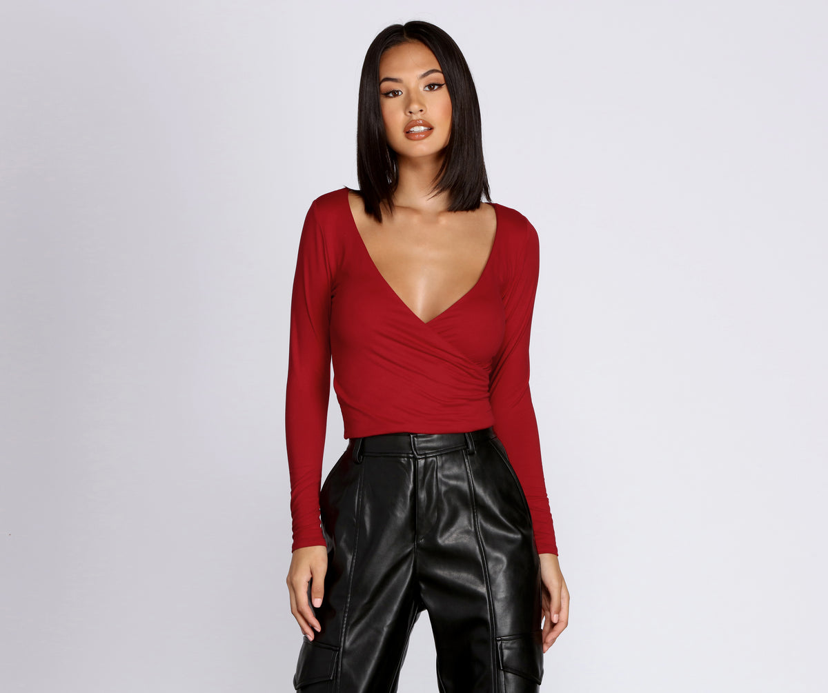 Simply stylish, this wrap front top is perfect for everyday. It features a V neckline, long fitted sleeves, a wrap front, and a mid-length hem. The top is composed of a soft, smooth knit fabric with plenty of stretch.