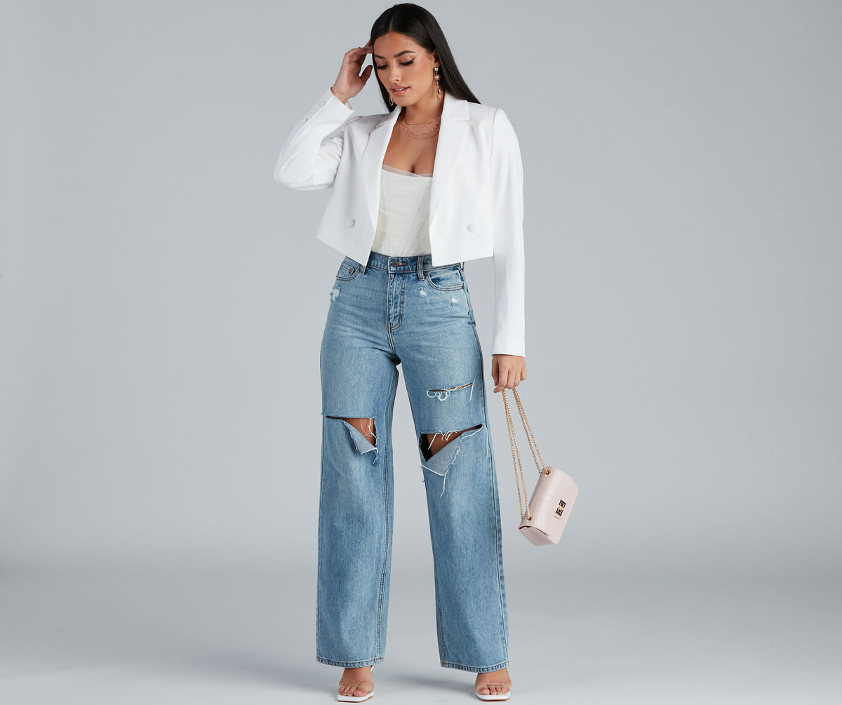Get a perf and polished look with this chic cropped blazer. It features structured shoulder pads, long sleeves with button detailing, a lapel collar, double-breasted button closures, and a cropped fit. Style this blazer with fauleather pants and clear heels for an elevated date night outfit.